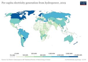 Still, the average electric dam accounts for less emissions per electricity produced than most solar electricity. In addition, it is important to identify the difference of origin between biomass related emissions (from reservoirs to ruminant digestion and wood burning) and fossil fuel related emissions (from oil to coal and fossil gas). The first is not adding carbon in the natural carbon cycle: it can be sustainable as long as carbon is stored again in growing biomass. The second emission brings back carbon that was eventually put out of the cycle when fossilised in the ground. By doing so, mankind disrupted the overall cycle as it used to work before the industrial revolution.[11] Off course, considering only the carbon footprint scope is not enough, and agriculture or reservoirs have their shared effort to make to mitigate climate change. But since more than 80%[12] of the energy consumed still rely on fossil fuel worldwide, and several countries are not using the full potential of their hydropower; we advocate for an energy mix that will foster hydropower at the expense of fossil fuels. Among the regions with the highest potential, Africa, the Middle East and Asia-Pacific are limited by the lack of fundings and/or political stability, as bordering countries downstream the rivers where dams are built can be impacted by water flow variations.[4] On the other side, Western countries like the Canada, the US and Russia seem shy to develop their hydropower potential, probably for political reasons related to their important fossil fuel resources. To conclude, it is important to state that most Northern countries — even the ones already exploiting more than half of their potential hydropower (Switzerland, Norway, Sweden, France, Austria, Japan) — should bet on the reduction of their overall energy consumption rather than new sources of renewable energy, since their carbon footprint per capita is already the highest since the beginning of the industrial era.[11]