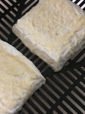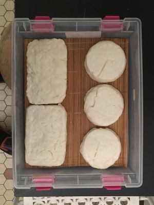Medium (x2) and small (x2) plastic baskets and cheesecloth. Unpressed and left to drain for 3 days. | - Dry salting on both sides after unmolding. Flipped and store in box in the Mush-room[8]. - Flipped daily for 4 days, with a few dark molds scraped of the surface. - Dark molds were left to grow freely on small pyramide. - Out of box to rest on hay and moistued with whey. - Small round and Medium brique: 20 days of ripening; Medium round: 50 days of ripening; Small square: 45 days of ripening. |