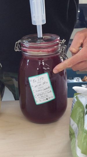 Cow full milk, unpasteurised, provided by Hoeve de Koeberg[2]. | Penicillium camemberti batch of cheeses. | Beetroot juice. Canne sugar. | 2 months in jars with air-release valves. |