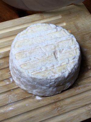 This was our first experience in bloomy soft cheeses (Brie, Camembert, Neufchâtel). They ask for the use of Penicillium camemberti to obtain a white “bloomy” rind. Instead of cutting the curds as for most cheeses, it has to be put directly in molds with the help of a ladle. Thus, the cheeses obtained are full of water (whey) and need to drain for a few days before to be unmolded. As a result, the cheeses thickness is shrinking drastically, but the inside stays soft. Those cheeses taste was milder than of a Camembert, closer to a Brie. They became runny as expected after some time in the fridge.